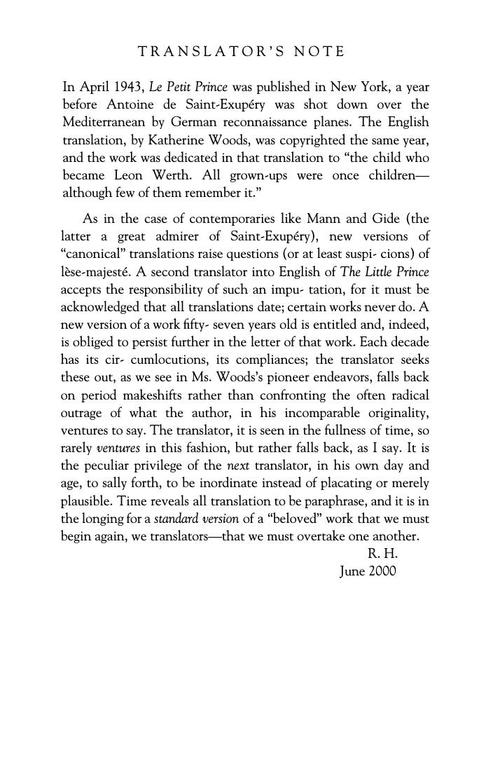 The main circulating English version of The Little Prince now is by the late poet Richard Howard. His version unseated the original by Katherine Woods. Howard’s work is considered by some more faithful to Saint-Exupéry’s simple, accessible prose, and is viewed by admirers as less stiff. (Also, Woods’s translation has one of the most famous translation errors.) By others, Howard’s translation is viewed as a failed assassination attempt. Howard foresaw this:
